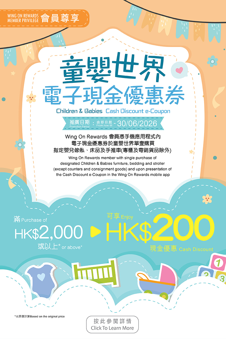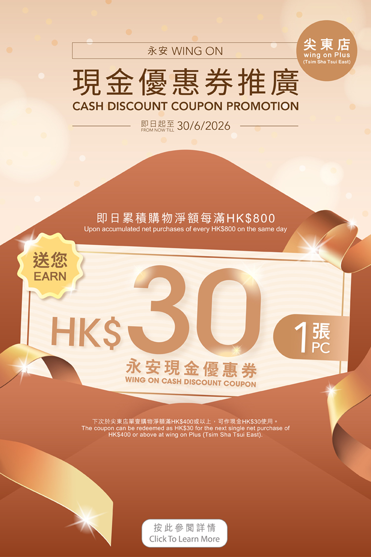 Wong On Plus (Tsim Sha Tsui East) HK$30 Wing On Cash Discount Coupon Promotion (Till 30 June, 2026)
